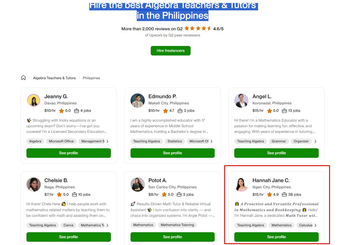 • Top 5 result for “Hire the best Mathematics Teachers & Tutors in the Philippines”