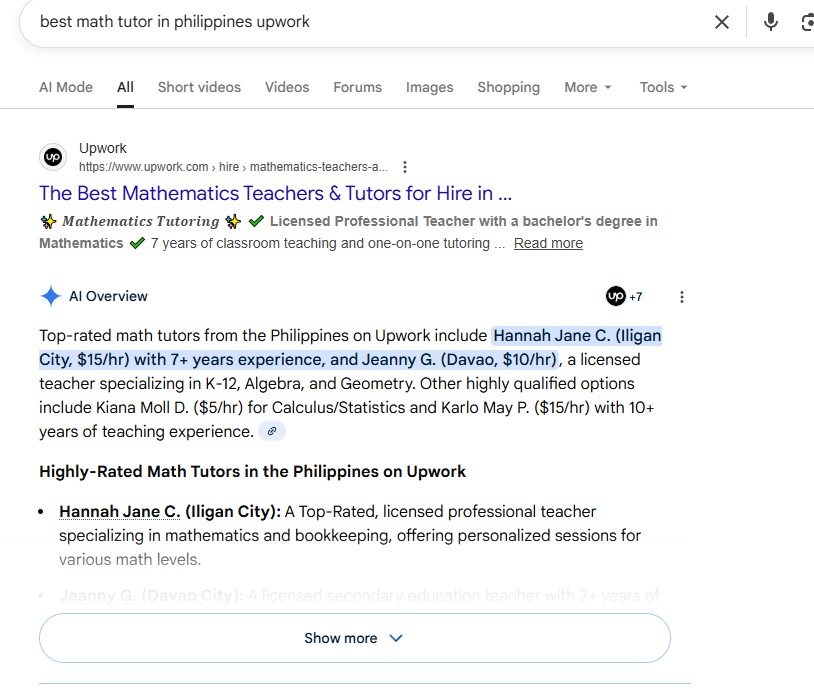 • Ranked number 1 for “best math tutor in Upwork Philippines” in AI search results